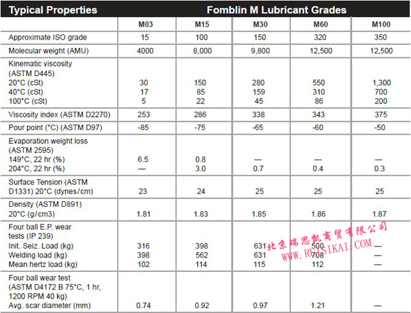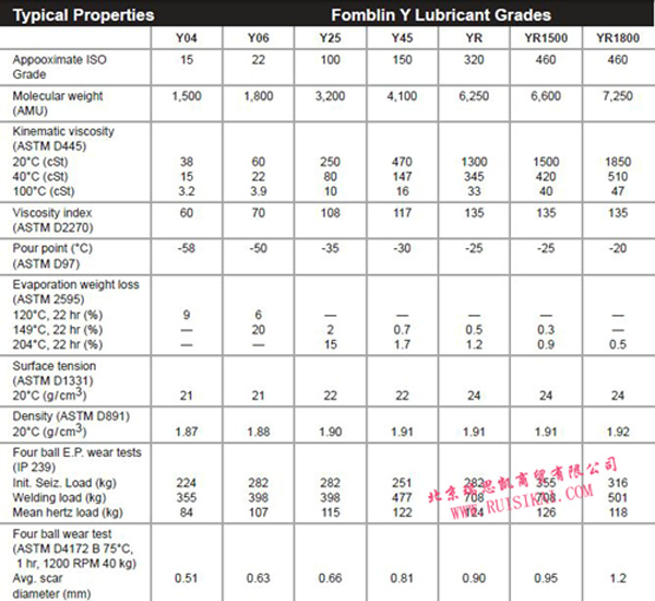 非常低的蒸汽压 优良的热稳定性 化学惰性 和金属,塑料,弹性体有良好的兼容性 很低的气体挥发性能 不可燃烧 产品系列 产品型号: Y04 Y06 Y25 Y45 YR YR1500 YR1800 产品型号: M03 M15 M30 M60 M100 W150 W200 W500 W800 Z03 Z15 Z25 Z60 产品型号: Y25/RP YR1800/RP M15/RP M30/RP M60/RP W800/RP 应用领域 润滑应用包括:轴承, 齿轮, 涡轮和接触凝缩水蒸气的液体压缩机,纺织工业拉幅定型器,深空火箭喷管润滑, 导弹弹射系统润滑,烧结金属轴承,防抱死制动系统,氧和氯阀泵系统,真空泵密封油,金接触表面润滑 ,核工业润滑,仪器仪表润滑,终生密封免维护轴承,外科设备润滑,汽油箱浮子润滑,暴露于高温,潮湿, 化学制品的轴承。Y04在薄膜电容器制造企业得到广泛使用。