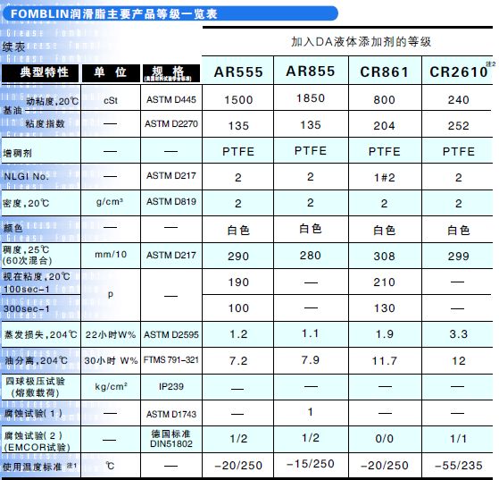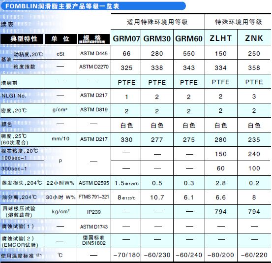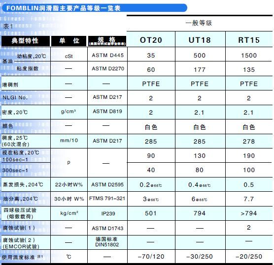 Fomblin潤滑脂具有很宽的工作温度性能,可在苛刻条件下作润滑使用,如高负载、长时间、耐腐蚀、抗氧化和辐射等。被广泛使用在: 洁净室、无尘室,食品加工和包装机械,造纸、纸浆,纺织,金属制造,低温冷冻装置 光学器材,精密仪器,无尘室,半导体制造业,军工,航空航 天,火箭,瓦楞纸,汽车、烤漆生产线及化学工业等。 产品型号: OT20 UT18 RT15 AR555 AR855 CR861 CR2610 YVAC1 YVAC2 YVAC3 GRM07 GRM30 GRM60 ZLHT ZNK YRT1 YRT2 YUH2 YUH2/3 YNX CL1800F AQ055 BT055 产品包装:100g针筒,100g牙膏,1kg桶