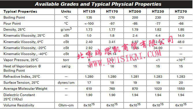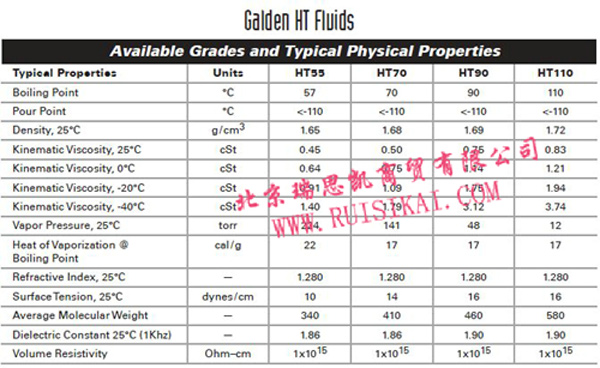 优异性能: Galden全氟聚醚流体是知名的较低分子量氟化流体. Galden全氟聚醚流体只包含碳, 氟, 氧三元素. Galden全氟聚醚流体性质是耐化学性, 热阻性, 无毒性, 卓越的介电性能,无闪点,无燃点低粘度. 适合于热热传导应用, Galden HT全氟聚醚流体提供55°C to 270°C宽范围沸点, 倾点<-115°C to -66°C. 典型使用温度范围超过300°C.